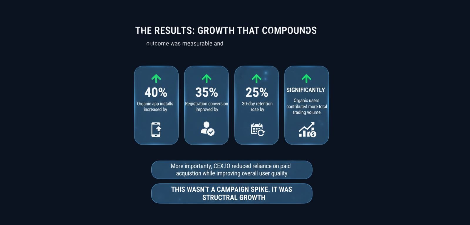 This framework strengthened every step of the user journey from discovery to trading activity, allowing the brand to scale without increasing reliance on paid channels. There were no inflated acquisition costs, no short-term tactics, and no growth that evaporates once budgets shift. Instead, the focus was on creating durable systems that consistently attract high-quality users who engage, convert, and stay.